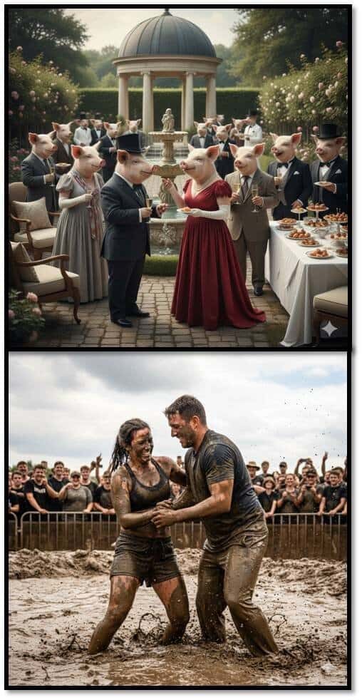 As I mentioned earlier, our mission was to find and consume Suillus mushrooms and this location had plenty of them. Unfortunately, this genus of sponge bottom mushrooms has been much maligned in many mushroom books so that many foragers, including us, have totally avoided them. Categorized as slime caps and relegated to being referred to as a subsistence food doesn’t help one’s culinary image. Additionally, the Latin word Suillus translates to “of or pertaining to pigs” or “swinish.” Now tell me, what species of animal looks more swinish and unsophisticated in this picture? Here you have a gathering of very sophisticated Sus domesticus enjoying a typical day of merrymaking. Conversely, Sue and Will are splashing in the mud, either wrestling or doing a bad dance version of the rumba. Subsequently, I would like to propose changing the Latin genus name of Suillus to the much more appropriate English name SueWillus; meaning “of or pertaining to slimy humans”.