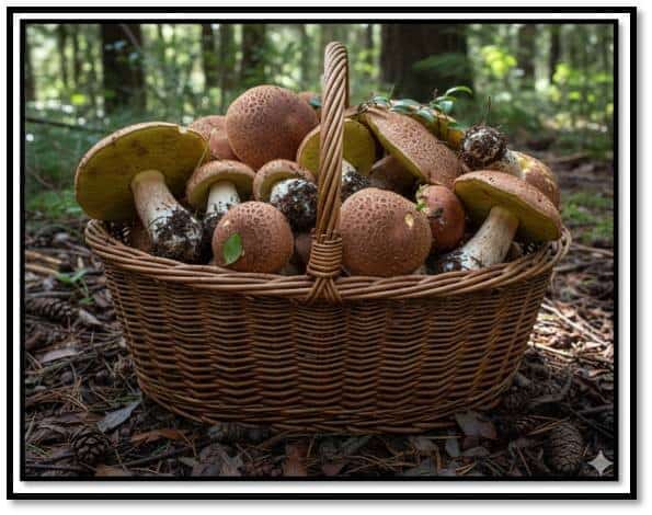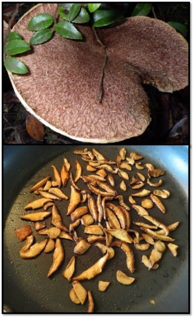 Anyway, the Suillus lakei mushrooms we collected were fairly clean already so only a little touchup cleaning was necessary. However, if you do feel the need to use slow running water to clean your mushrooms, be careful not to wet their sponge bottom as it will soak all that water right up. Some people suggest peeling off the cap’s top layer or cuticle. Since ours were young, firm specimens, there was no need to peel off their cuticle or remove their sponge bottom. We sliced these beauties into thin pieces and sautéed them in butter until they had a nice golden color. You can see by the picture that a pan full quickly reduced down to enough for a snack or side dish. In our opinion, the flavor of this mushroom exceeded the mushroom book’s edibility description of simply being “Edible.” I often wonder if mushroom book authors actually try eating mushrooms before listing an edibility rating or do they just mimic what someone else put in their book. Maybe they should include a disclaimer for each edible species as to having firsthand knowledge or just passing on what someone else wrote about their edibility.