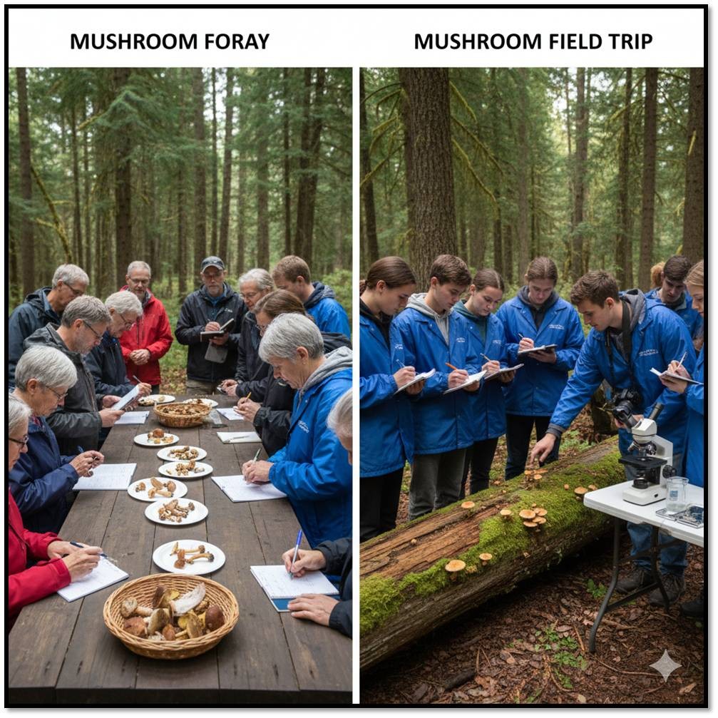 Then I asked Gemini to create a split image where one side depicts a classic mushroom foray and the other a classic mushroom field trip in a way that their differences are easily apparent to the viewer. My first impression of Gemini’s image was the age difference between the two groups. The field trip side reminded me of several organized trips I took during high school, however; I don’t remember having those cool looking blue jackets they’re all wearing. The foray group certainly wins the age contest and they also look quite absorbed in identifying and recording what they found. The common attribute depicted in both images seems to be education and hopefully enjoyment. Additionally, I reviewed the Puget Sound Mycological Society’s website where they describe both their Field Trips and Forays.